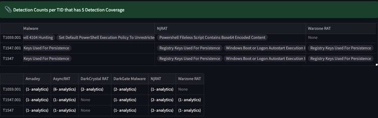 We've categorized Splunk detections under each MITRE ATT&CK technique ID to assess our detection coverage across the shared IDs among all malware families. Here are our findings based on this analysis.