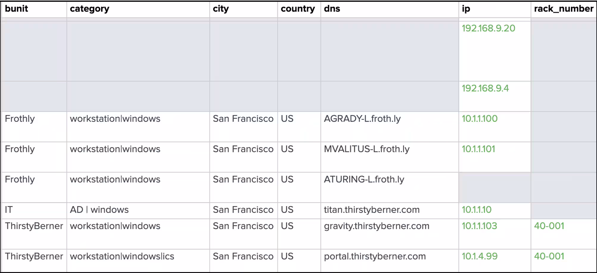 Let’s add a few rack numbers to our lookup, frothly_assets_2019. In a case of poor planning, our admins are not clear about where 10.1.4.99 resides and in this lookup, that system has a rack number of 40-001 assigned to it.
