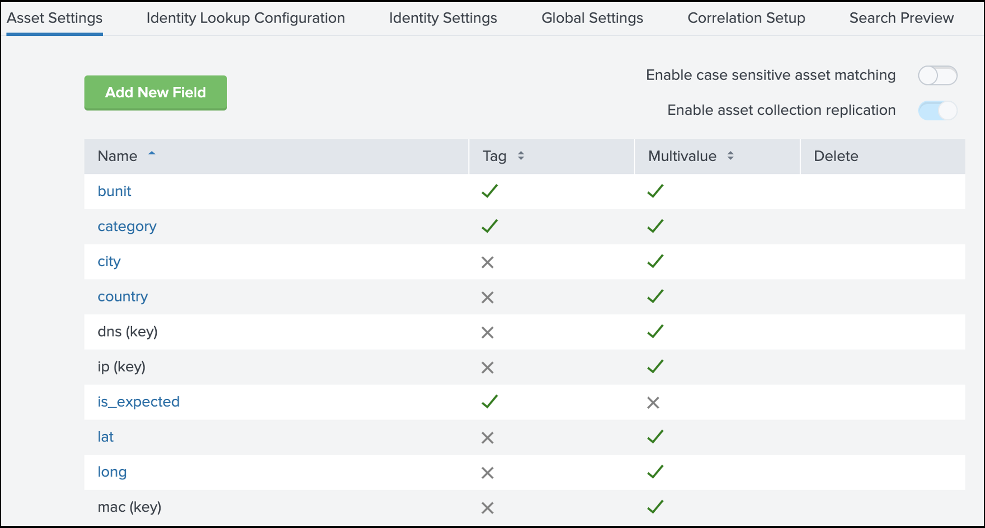 If we want to add additional fields to our assets, we can click on the Asset Settings tab where we can view all of the current asset fields. These will include the fields that you are already familiar with like ip, nt_host, country, bunit and more.