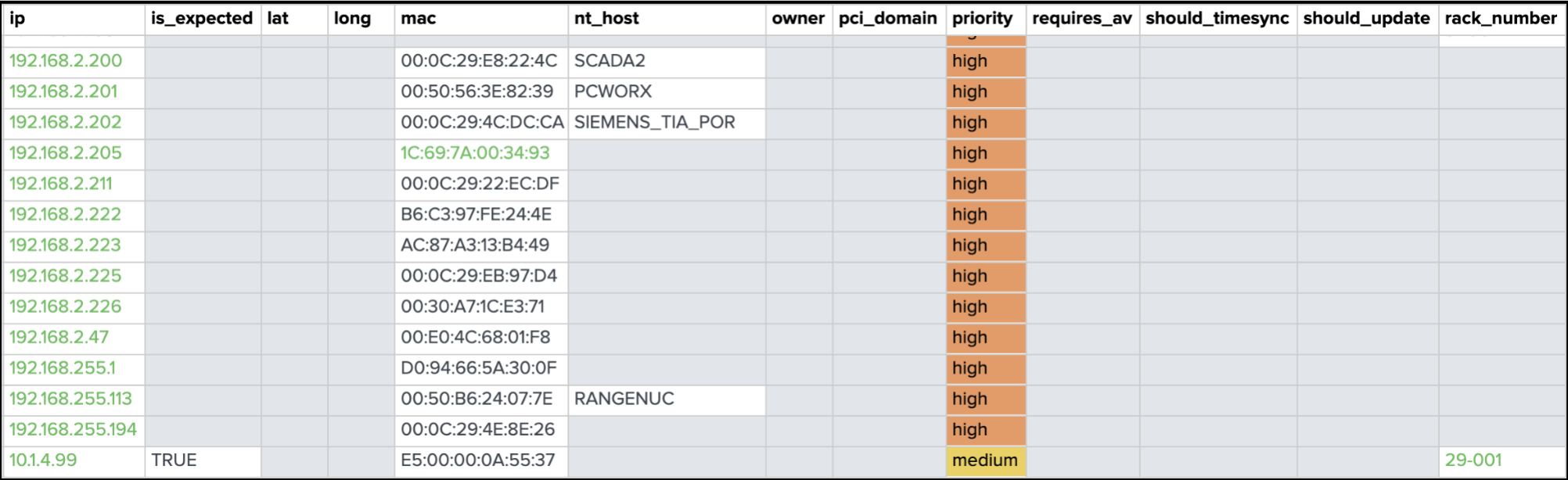 We can see that 10.1.4.99 has a rack number of 29-001. When the two lists converge, even though I don’t have the field rack_number in frothly_assets_2019, the rack_number from Thirsty Berner ICS Assets is returned in the converged asset record and if you look closely, you will notice that the priority from frothly_assets_2019 came across because it has a higher rank over the medium priority in Thirsty Berner ICS Assets. This was something we covered in our first blog on asset & identity framework if you recall, Steven.
