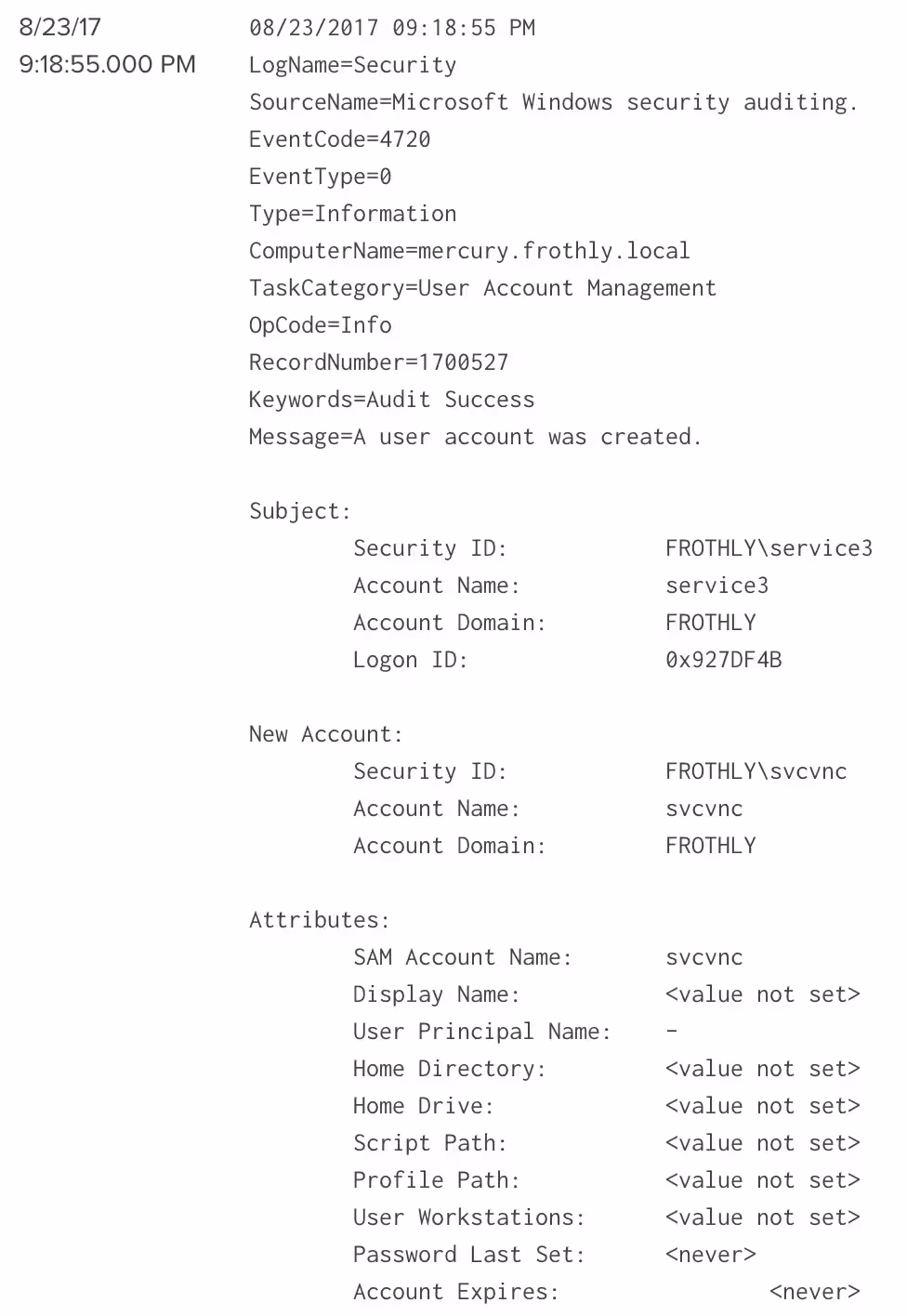 Based on my research, I can see that a user named “service3” created a new account called “svcvnc” on a system named mercury. I can also see that there were no additional attributes set. With that basic understanding, I could go hunt to see if any other systems had these same characteristics.