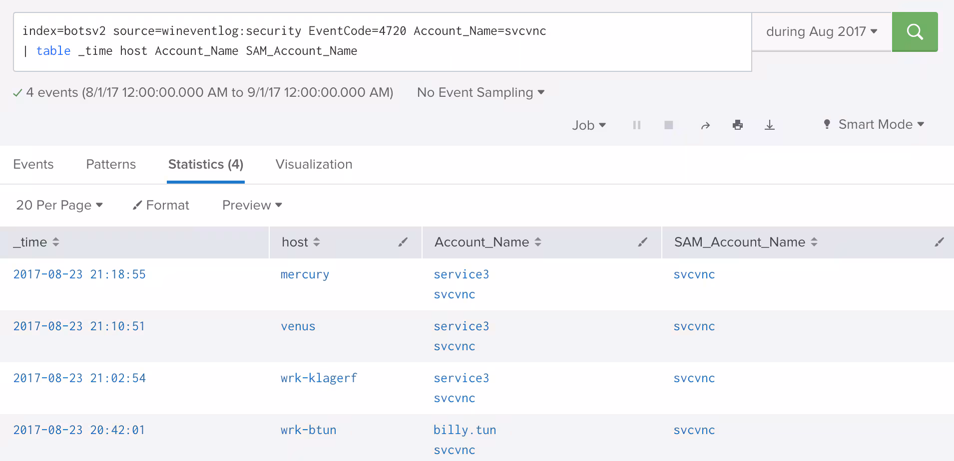 Based on our results, the system mercury is not the only one impacted. It is also interesting to see that service3 is referenced in three events, but another username is associated with a fourth event. This provides additional information that I can then search off of and continue to evolve my hunt.