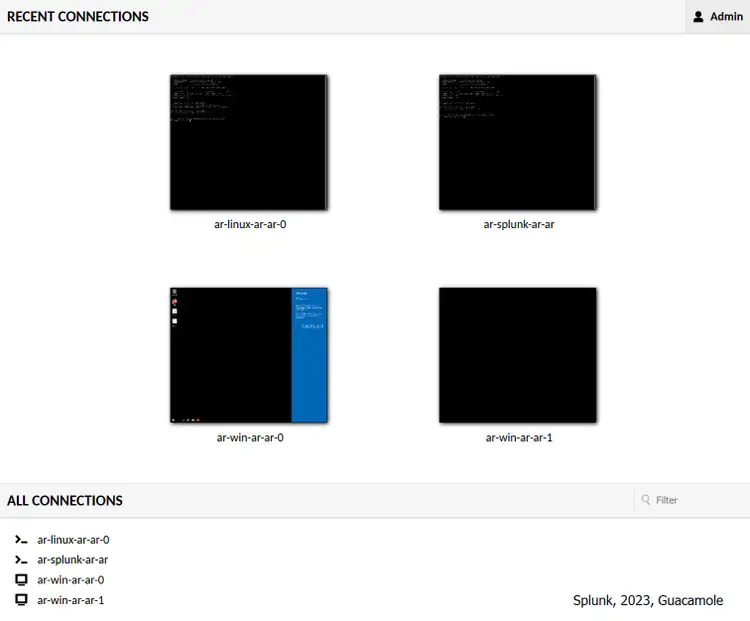 Based on your feedback, we learned that the Attack Range is often used in training and workshops in which the trainer prepared the Attack Ranges for their students. Providing Attack Range access to students was difficult. This is now simplified by integrating Apache Guacamole into the Attack Range. Apache Guacamole is a clientless remote desktop application which is installed on the Splunk Server. It supports standard protocols such as SSH and RDP. During the Attack Range build, Apache Guacamole is installed and completely configured. You can access Apache Guacamole on port 8080 and use the Attack Range password to log in. Subsequently, you can access the windows server over RDP or the other servers with SSH using the browser.