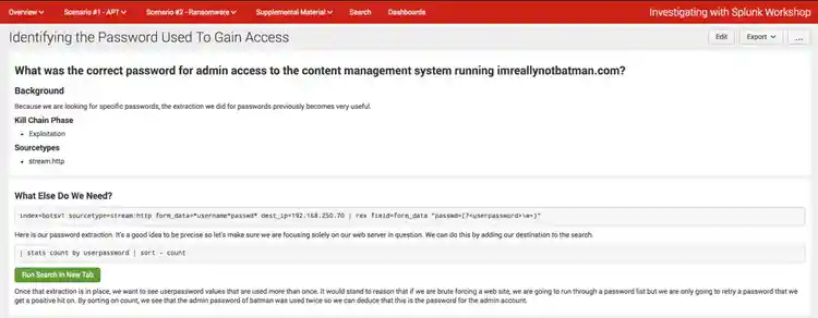 The APT scenario maps each concept to a part of the Lockheed Martin Kill Chain as well as sourcetypes that are useful for answering the question based on the data set provided. Sample searches are provided, and if new transformational search commands are introduced, explanations for those commands are provided. Since some users like to see the output of the searches immediately, results are shown in the app. However, if you are someone who loves to explore the data, clicking the green button will open a new tab where the search is run, and you can then pivot on interesting fields and further manipulate the search to your liking.