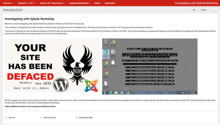 The Boss of the SOC Investigation Workshop for Splunk app was built to help security professionals learn more about how to use Splunk to investigate, map their findings to the Lockheed Martin Kill Chain and create a threat picture to better answer questions that your leadership inevitably will ask of their analysts. The app leverages the BOTS dataset and focuses on two scenarios, APT and Ransomware. Let's take a look: