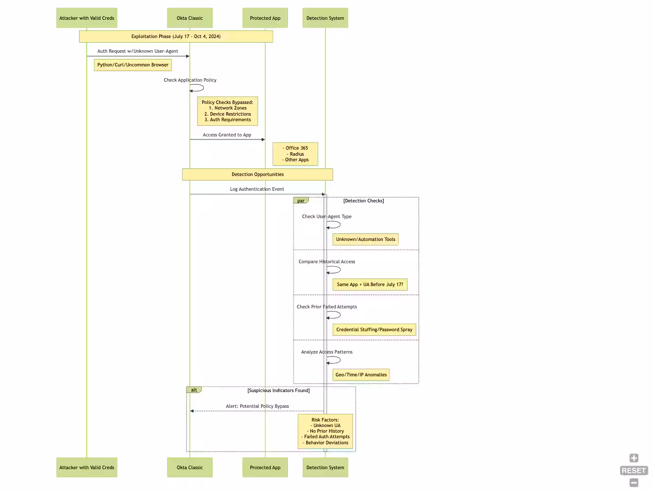 The sequence diagram above illustrates both the exploitation path and detection opportunities for the Okta Classic Application Sign-On Policy bypass vulnerability that existed between July 17 and October 4, 2024. The flow shows how an attacker with valid credentials could bypass application-specific policies simply by using an unknown user-agent string, circumventing critical security controls such as network zones and device restrictions. The right side of the diagram highlights the parallel detection strategies defenders should employ, including user-agent analysis, historical access comparison, failed authentication attempt correlation, and behavioral analytics. These detection methods, when combined, help identify both active exploitation attempts and historical incidents that may have occurred during the vulnerability window.