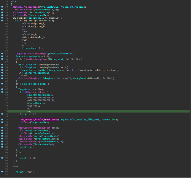 CastleRAT abuses the Appinfo service UUID to ask Windows to launch a trusted binary (ComputerDefaults.exe) under a privileged context. It then attaches a debug thread (ThreadDebugObject) and monitors a specific debug event (event 3) to learn when the target process exposes a handle. Observing that event lets the malware identify a process handle it can duplicate via NtDuplicateObject () API. The duplicated handle is then inherited or injected into a newly spawned malware process, granting access to the privileged target. This handle-stealing pattern enables stealthy privilege escalation and in-memory tampering while minimizing on-disk footprints and complicates forensic analysis and remediation efforts.