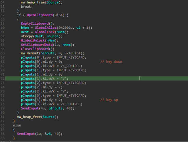 CastleRAT also hijacks the clipboard and simulates paste actions to exfiltrate data stealthily. Rather than opening its own network socket or calling obvious network APIs, the malware copies harvested information to the clipboard and invokes SendInput() (or synthesizes a Ctrl+V) to paste that data into a benign-looking application or web form (for example, a chat client or browser field). By piggybacking on normal user-visible actions, this technique reduces noisy network artifacts and blends exfiltration into ordinary activity, complicating detection and forensic attribution.