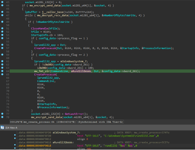 This RAT uses the RC4 stream cipher to encrypt and decrypt data sent to and received from its command‑and‑control server. Figure 4 shows a code snippet from a thread that handles the decryption of CastleRAT DLL plugins downloaded from its C2 server and then launches those plugins using the Windows utility rundll32.exe.