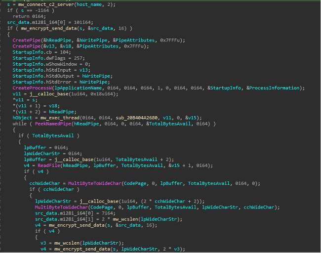 CastleRAT can give an attacker a remote shell on an infected machine by sending backdoor commands to the RAT client running on the victim. Rather than simply launching a visible cmd.exe or powershell.exe window, one technique we observed is that this malware spawns a terminal process using anonymous inter‑process communication (IPC) pipes. In practice the malware creates a pair of anonymous pipes and starts the chosen shell with its standard input, output and error handles redirected to those pipes; the RAT then writes commands into the shell’s input pipe and reads the command output from the shell’s output pipe. To the attacker this behaves like an interactive shell, but it runs without a user seeing a console window and without the shell being directly connected to a keyboard or desktop session.