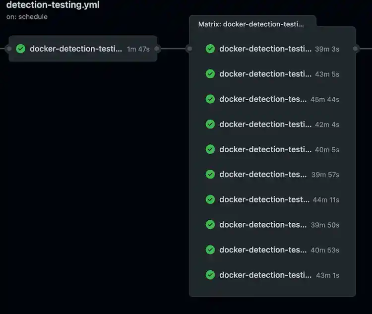 The GitHub Actions Matrix makes it possible to scale the testing framework by increasing the number of tests executing in parallel. For example, dynamically splitting 600 detections into 10 parallel detection test jobs means just 60 detections per job. This lets detection testing complete in 1/10th of the time and avoids the 6-hour maximum job execution time limit.