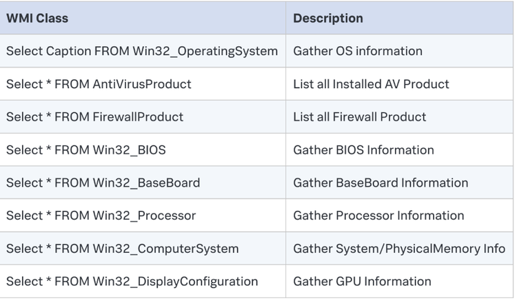 We’ve seen an example of AgentTesla in the previous section. The figure below shows the list of WMI commands used by Quasar RAT for its system information discovery.