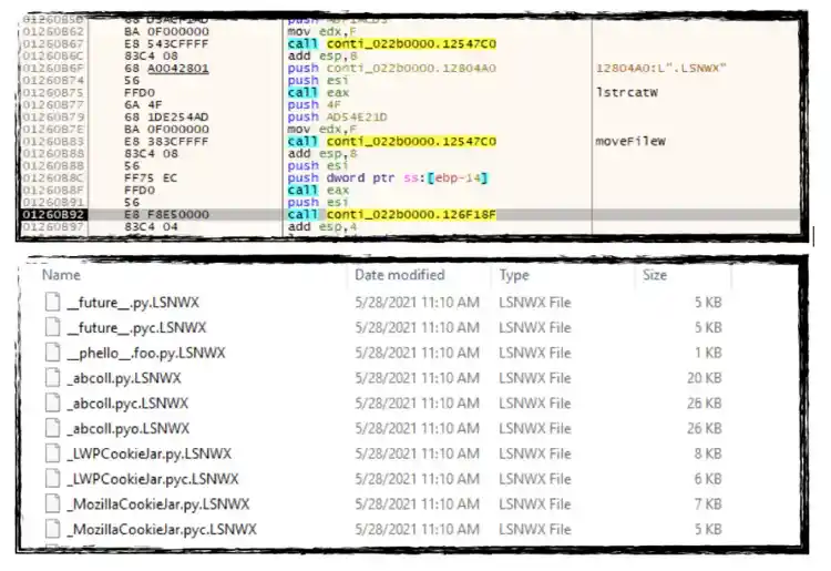 In the Conti sample we have analyzed, we found that it uses the “.LSNWX” file extension for all files it will encrypt in either/both local drive and network share. Below are screenshots of its code creating .LSNWX files, as well as some files getting encrypted.