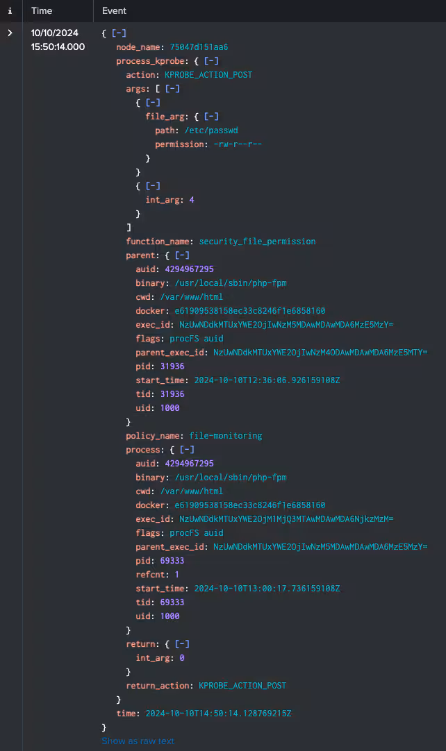 This policy generates events when binaries in the "/usr/local/sbin" directory access files outside of the webroot directory as well as a more specific selector for env.php, providing an additional layer of detection for potential CosmicSting exploitation attempts. When an exploit is executed against a vulnerable Magento instance, Tetragon can generate an event showing the underlying process (e.g., "/usr/local/sbin/php-fpm") accessing sensitive files like "/etc/passwd".