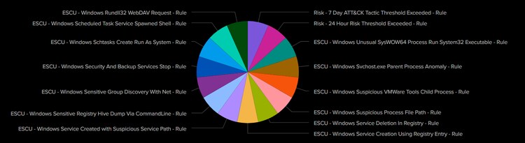 Many of our built-in ESCU detections triggered as expected, successfully catching a plethora of techniques. Below is a pie chart covering the TOP 15 detections that were triggered over the course of the exercise.