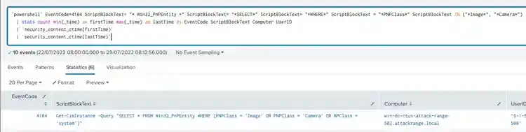 The following analytic detects a powershell script that enumerates the camera mounted to the targeted host.