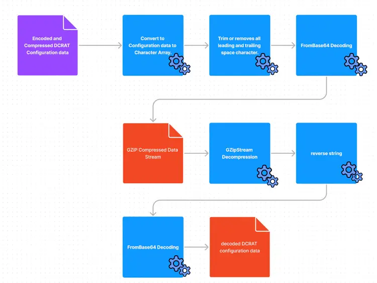 Figure 2.3 shows the simple Directed Acyclic Graph (DAG) how this DCRAT malware variant decodes and decompresses its configuration data. The graph shows the use of the Base64 encoding algorithm and compression streams to hide its configuration data.