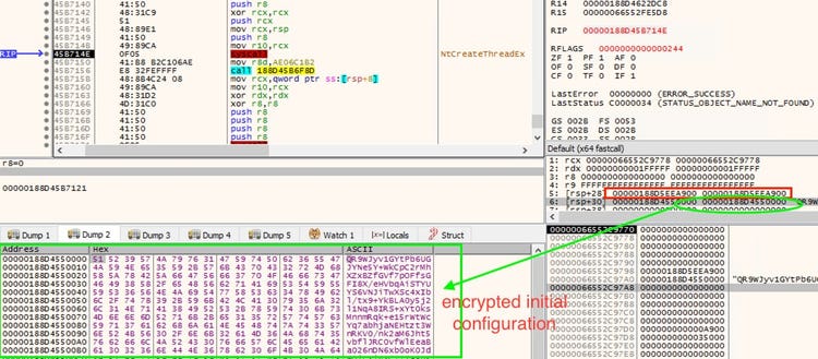 Figure 5 shows the code that runs a syscall function to execute the NtCreateThreadEx Windows API with the startAddress argument pointing to the “bruteloader” export function of the BRC4 DLL agent loaded in memory. This thread also has an argument that points to the encoded and encrypted initial configuration that will be used for its C2 communication and beaconing.