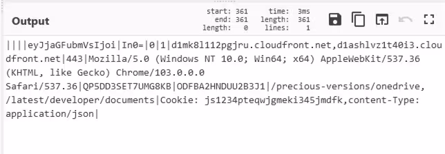 The configuration data is encoded with base64 and encrypted with RC4 with the passphrase key “bYXJm/3#M?:XyMBF”. Figure 6 is the decrypted version of this configuration data that contains the command and control servers, port (HTTPS), user agent, cookie, and many more details.
