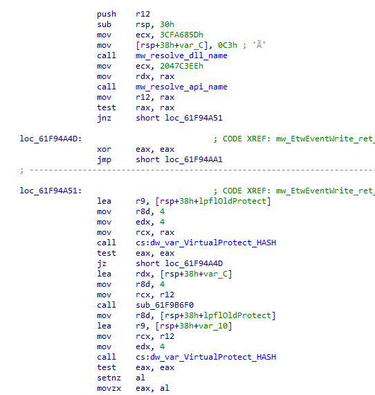 Another interesting feature of the BRC4 DLL agent is that it can evade Event Tracing for Windows (ETW) and AMSI Windows mechanisms by patching known API responsible for generating or tracing system events.