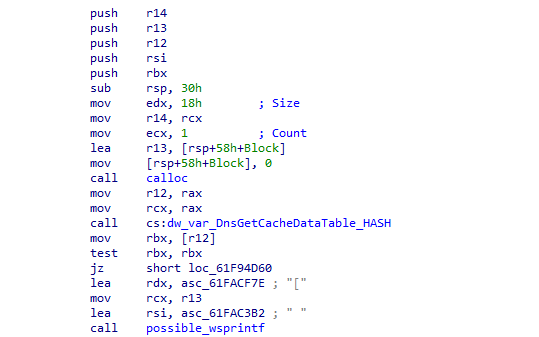 Figure 10 shows the code snippet implemented by BRC4 to parse the DNS cache record of the infected host using the undocumented DnsGetcacheDataTable Windows API.