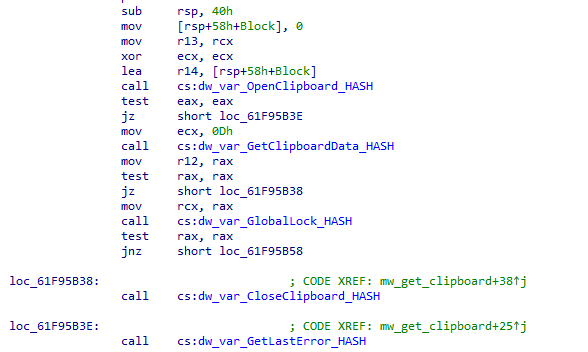 Figure 9 shows the code snippet BRC4 uses to parse or copy the clipboard data on the targeted host using the Windows API functions OpenClipboard and GetClipboardData.