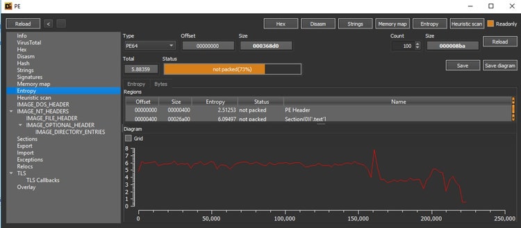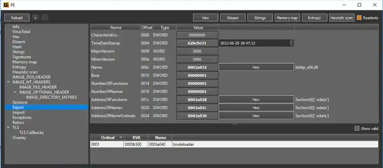 Once the DLL agent is placed in the executable memory page, we can export it to disk to perform static analysis. We used the Detect It Easy tool to perform high level analysis of the extracted BRC4 DLL and obtain information such as the exported functions (Figure 4.1), the entropy of the file and each section (Figure 4.2), etc.