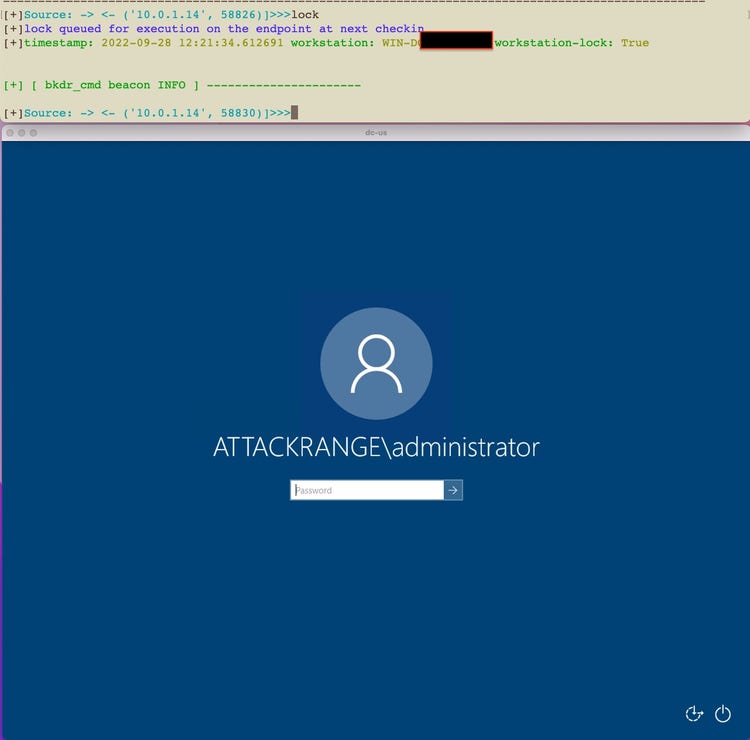 As another example, Figure 15 shows the screenshot of how we simulate the technique of locking the screen of the targeted workstation. The C2 server operator runs the “lock” command to instruct the agent running in the victim host to execute the simulated workstation lock screen code.