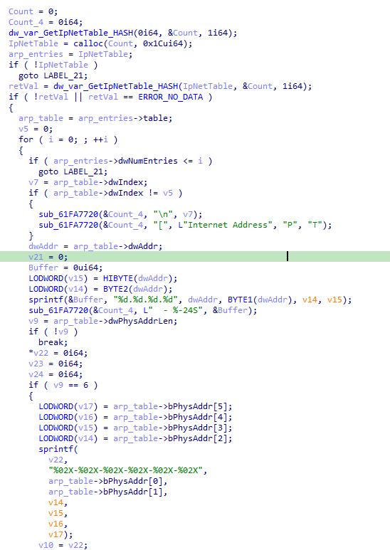 Figure 14 shows the code snippet of the function that enumerates Address Resolution Protocol (ARP) entries or physical address map table for IPV4 on the local system using the GetIpNetTable Windows API.