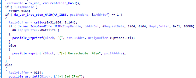 Figure 7 shows the code with the resolved API hash value on how to implement a PING to a target host using those Windows APIs.