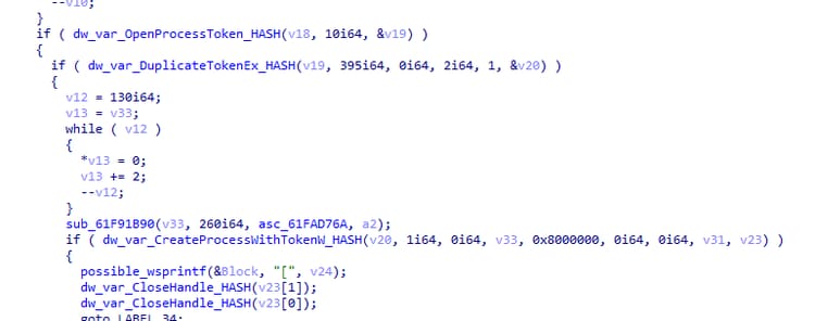 Figure 11 shows the code function that duplicates the token of “winlogon.exe” or “logonui.exe” and uses that token to a new process using CreateProcessWithTokenW API.