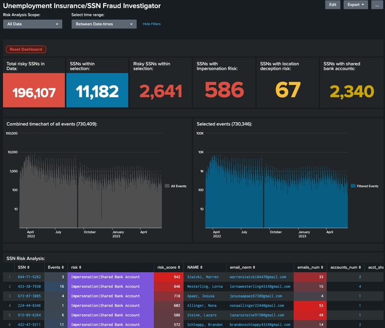 The fraudsters saw this as an opportunity to step in and make fraudulent claims, sometimes on behalf of innocent people, so that they could steal the funds set aside for affected individuals. This has cost state and federal governments billions of dollars. The Splunk App for Fraud Analytics can definitely help here as well. Splunk can ingest the logs from the systems of record where the claims are processed and additional analytics and detections to help identify events indicative of unemployment fraud, like: