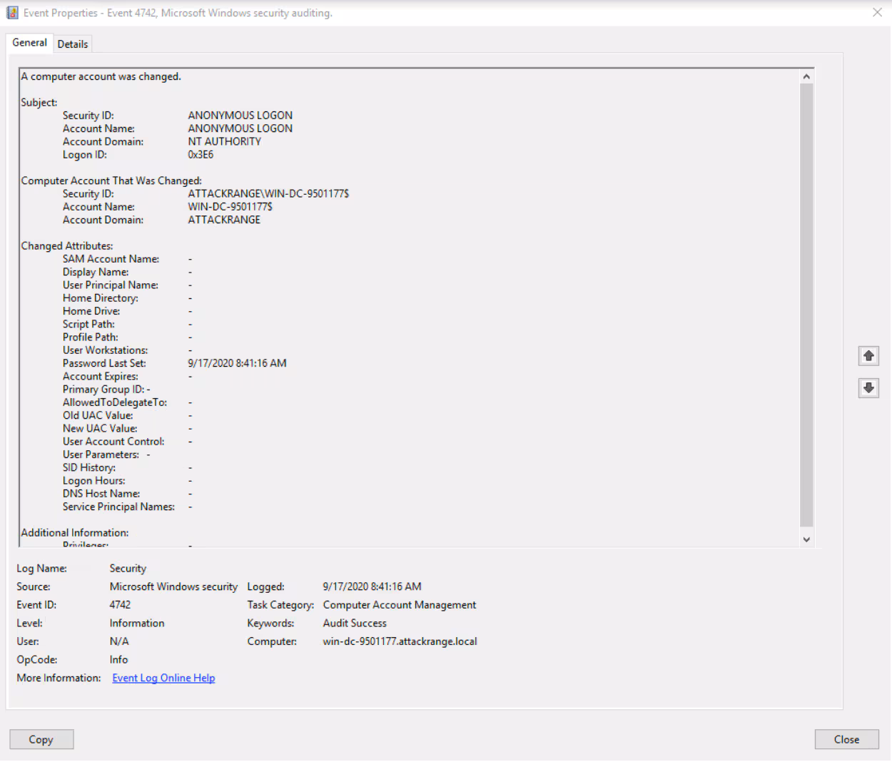 The screenshot above on the left side contains the events that occurred during attack execution. Starting from the bottom, EventID 1102 (logs cleared) followed by EventID 5152 (connections blocked) only appears if enabled by audit, and is caused by traffic sent from the attacking machine. EventID 4742 (A computer account was changed) event does not reveal specific signs of exploitation on its own, but it was found consistently across all operating systems we tested the exploit on (Windows 2008R2 Server, Windows 2012R2, Windows 2016 Server, and Windows 2019 Server). EventID 4742 indicates a computer account was changed. Computer accounts in Active Directory are usually followed by a single dollar sign. This specific event shows Security ID: ANONYMOUS LOGON, Account Name: ANONYMOUS LOGON, and Account Domain: NT AUTHORITY.