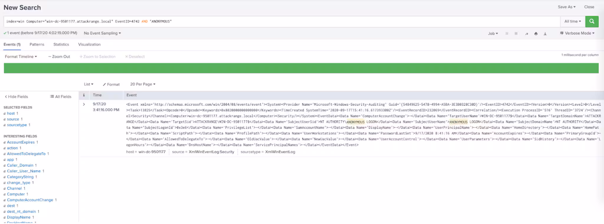Research suggests that the best course of action against this threat is a multi-factor approach. Combining network detection via Zeek sensors using the detection “Detect Zerologon via Zeek” contributed by Splunk’s Senior Security Sales Engineer Shannon Davis. As well as leveraging EDR logs to find MimiKatz using the detections discussed above. Finally, monitoring windows security event logs that contain Event ID 4742 (Computer Account Change) that look like this: