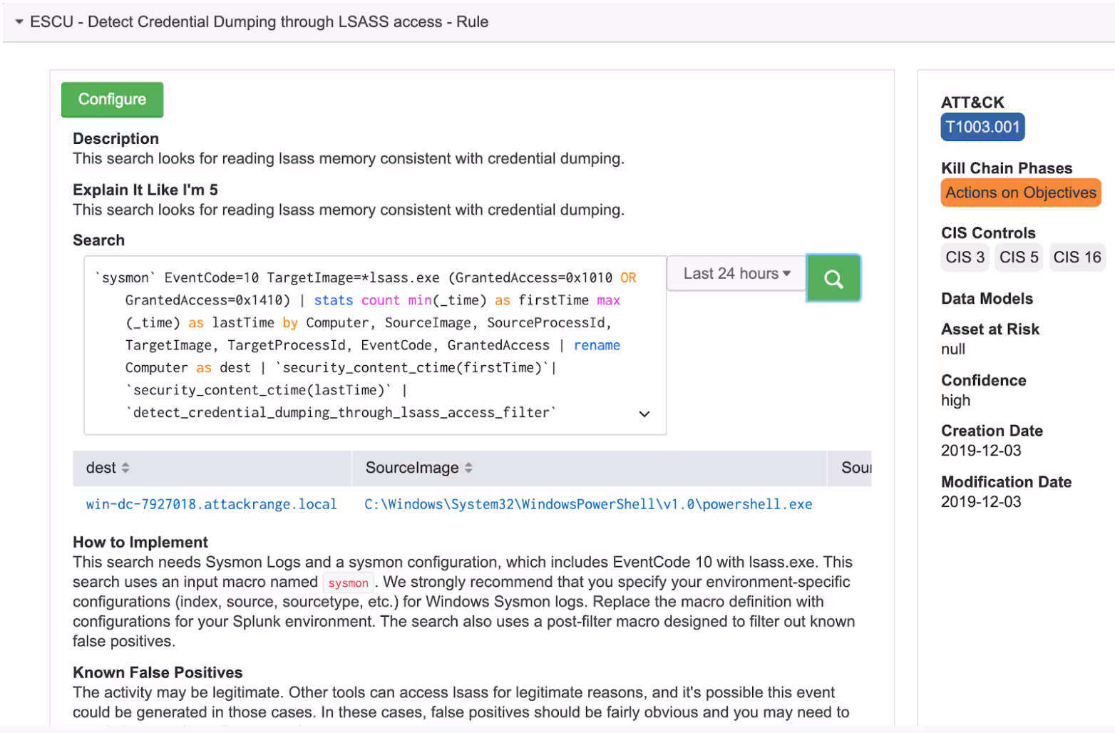 This vulnerability is not only extremely serious but based on the nature of its execution such as unauthenticated RPC calls, it can also be very difficult to detect. This is especially significant in environments where audit logging or deep packet inspection technology are not in place. The recent addition of this attack to the popular credential attack tool MimiKatz, will likely make this attack very popular. Fortunately, Splunk ESCU has two detection searches that find Mimikatz. The first detection leverages Event Code 10 from source type Sysmon. Below is a screenshot of the MimiKatz execution and the results of the “Detect Credential Dumping through LSASS access” detection executing from ESCU.
