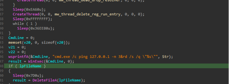 Figure 08 shows a code snippet from Gh0st RAT implementing a ping-based sleep technique. The malware leverages ping.exe with the -n parameter to introduce a delay in execution. This delay is used to pause before running the actual payload, which in this case deletes all subdirectories within the target directory in quiet mode.