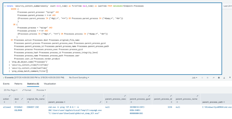 The following analytic identifies the execution of ping sleep batch commands. It leverages data from Endpoint Detection and Response (EDR) agents, focusing on process and parent process command-line details. This activity is significant as it indicates an attempt to delay malicious code execution, potentially evading detection or sandbox analysis.