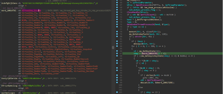 Lastly, this RAT monitors the mstsc.exe process, which is the client used for Remote Desktop Protocol (RDP) connections in Windows. Once it detects that mstsc.exe is running on the compromised host, it begins tracking user input by calling Windows APIs such as GetKeyState() and GetAsyncKeyState(). These functions allow the malware to capture keystrokes in real time, effectively acting as a keylogger. By focusing specifically on an active RDP session, the attacker can intercept sensitive information such as usernames, passwords, and other data entered during the session. This targeted approach increases the likelihood of capturing valid credentials for remote systems, enabling lateral movement or further compromise within the network while remaining relatively stealthy.