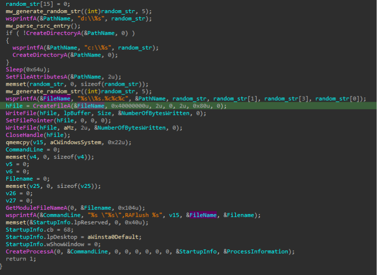 After that, the loader checks whether the malware process file path is in the %temp% folder. If not, it drops a copy of the running malware, then decrypts another .DLL payload, which is the Gh0st RAT client module encrypted as a resource entry in the RSRC section of the malware. After decryption, it generates a random file name and extension and saves it in a randomly generated folder in the root of the C:\ drive. The decrypted DLL is then executed using the rundll32.exe Windows application, as shown in Figure 02.