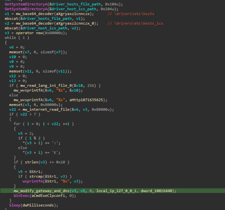 This Gh0st RAT variant can block access to specific domains, such as security-related websites, by utilizing a configuration file retrieved from its Command and Control (C2) server. To achieve this, the malware modifies the local hosts file and generates spoofed DNS responses to intercept and redirect traffic away from legitimate security resources.