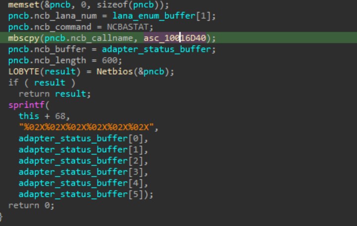 The NCBASTAT request returns an ADAPTER_STATUS structure that contains low-level details about the network interface, including the MAC address. The malware accesses the adapter_address field from this structure and formats it into a readable MAC address string.