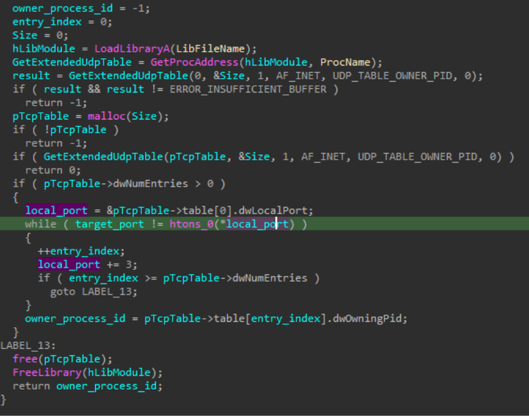 Figure 05 shows a screenshot of a function within this RAT that identifies the process associated with DNS traffic on port 53. This is achieved using the Windows API GetExtendedUdpTable(), which returns a table of active UDP endpoints, including local ports and their corresponding process IDs. This behavior supports system network discovery and may also aid in defense evasion, as discussed in the next section.