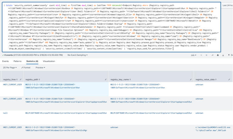 | tstats `security_content_summariesonly` count min(_time) as firstTime max(_time) as lastTime FROM datamodel=Endpoint.Registry where (Registry.registry_path=*\\SOFTWARE\\Microsoft\\Windows\\CurrentVersion\\RunOnce OR Registry.registry_path=*\\SOFTWARE\\Microsoft\\Windows\\CurrentVersion\\Explorer\\StartupApproved\\Run OR Registry.registry_path= "*\\Software\\Microsoft\\Windows\\CurrentVersion\\Explorer\\User Shell Folders\\*" OR Registry.registry_path= "*\\Software\\Microsoft\\Windows\\CurrentVersion\\Explorer\\Shell Folders\\*" OR Registry.registry_path=*\\currentversion\\run* OR Registry.registry_path=*\\currentVersion\\Windows\\Appinit_Dlls* OR Registry.registry_path=*\\CurrentVersion\\Winlogon\\Shell* OR Registry.registry_path=*\\CurrentVersion\\Winlogon\\Notify* OR Registry.registry_path=*\\CurrentVersion\\Winlogon\\Userinit* OR Registry.registry_path=*\\CurrentVersion\\Winlogon\\VmApplet* OR Registry.registry_path=*\\currentversion\\policies\\explorer\\run* OR Registry.registry_path=*\\currentversion\\runservices* OR Registry.registry_path=*\\SOFTWARE\\Microsoft\\Netsh\\* OR Registry.registry_path= "*\\Software\\Microsoft\\Windows\\CurrentVersion\\Explorer\\Shell Folders\\Common Startup" OR Registry.registry_path= *\\SOFTWARE\\Microsoft\\Windows\\CurrentVersion\\Explorer\\SharedTaskScheduler OR Registry.registry_path= *\\Classes\\htmlfile\\shell\\open\\command OR (Registry.registry_path="*Microsoft\\Windows NT\\CurrentVersion\\Image File Execution Options*" AND Registry.registry_key_name=Debugger) OR (Registry.registry_path="*\\CurrentControlSet\\Control\\Lsa" AND Registry.registry_key_name="Security Packages") OR (Registry.registry_path="*\\CurrentControlSet\\Control\\Lsa\\OSConfig" AND Registry.registry_key_name="Security Packages") OR (Registry.registry_path="*\\Microsoft\\Windows NT\\CurrentVersion\\SilentProcessExit\\*") OR (Registry.registry_path="*currentVersion\\Windows" AND Registry.registry_key_name="Load") OR (Registry.registry_path="*\\CurrentVersion" AND Registry.registry_key_name="Svchost") OR (Registry.registry_path="*\\CurrentControlSet\Control\Session Manager"AND Registry.registry_key_name="BootExecute") OR (Registry.registry_path="*\\Software\\Run" AND Registry.registry_key_name="auto_update")) by Registry.action Registry.dest Registry.process_guid Registry.process_id Registry.registry_hive Registry.registry_path Registry.registry_key_name Registry.registry_value_data Registry.registry_value_name Registry.registry_value_type Registry.status Registry.user Registry.vendor_product | `drop_dm_object_name(Registry)` | `security_content_ctime(firstTime)` | `security_content_ctime(lastTime)` | `registry_keys_used_for_persistence_filter`