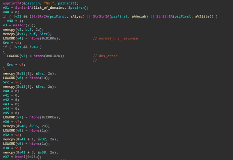 Figure 10 shows a code snippet from Gh0st RAT responsible for generating spoofed DNS responses. The malware specifically targets antivirus-related domains by checking for the following substrings: “Alyac”, “Ahnlab” and “V3lite”.