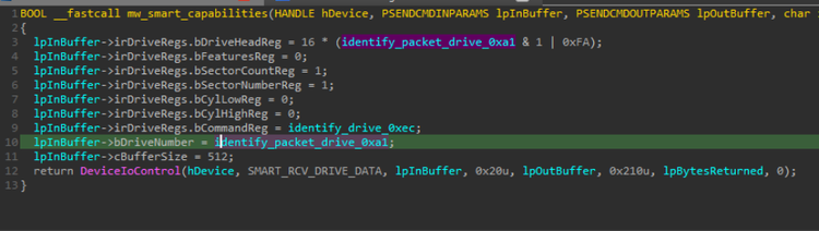Next, the malware attempts to retrieve the physical hard drive serial number using a Device I/O control (IOCTL) request, specifically SMART_RCV_DRIVE_DATA. This IOCTL is commonly used to access S.M.A.R.T. (Self-Monitoring, Analysis, and Reporting Technology) data directly from the disk.