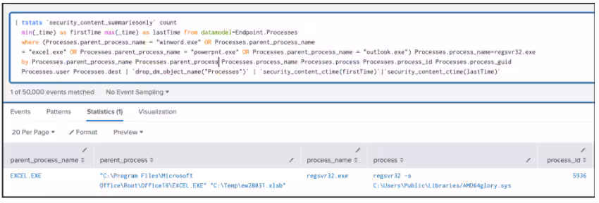 as lastTime from datamodel=Endpoint.Processes where Processes.process_name=regsvr32.exe