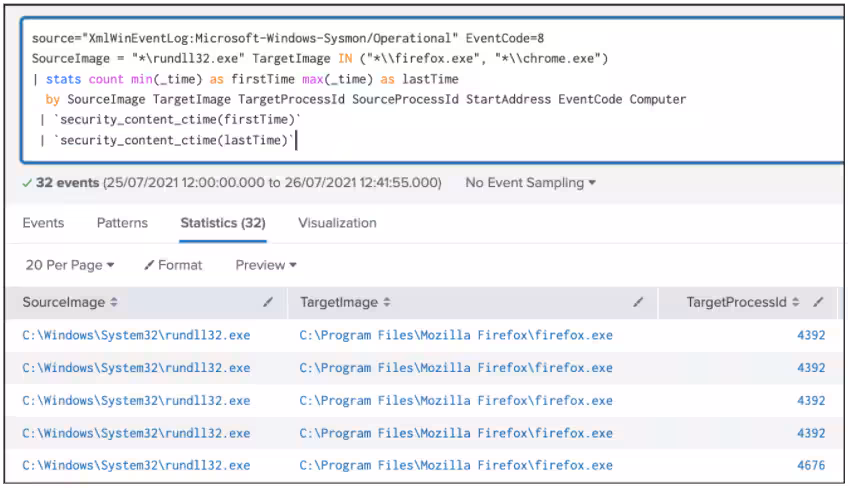 `sysmon` EventCode=8 SourceImage = "*\\rundll32.exe" TargetImage IN ("*\\firefox.exe", "*\\chrome.exe")